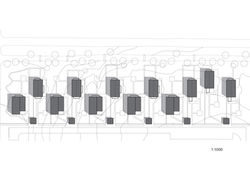 The houses are staggered in plan to raise the settlement density whilst adhering to requirements for light and privacy. There are no fences around individual sites creating a coherent sense of community and shared space, and all dwellings have south facing balconies and terraces. Each house has a double-height living room space, fireplace, sauna and covered parking space.